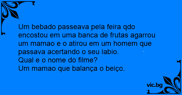 Um bebado passeava pela feira qdo encostou em uma banca de frutas agarrou um mamao e o atirou em um homem que passava acertando o seu labio.