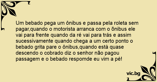 Um bebado pega um ônibus e passa pela roleta sem pagar,quando o motorista arranca com o õnibus ele vai para frente quando da ré vai para trás e assim sucessivamente quando chega a um certo ponto o bebado grita pare o ônibus,quando està quase descendo o cobrado diz o senhor não pagou passagem e o bebado respomde eu vim a pè!