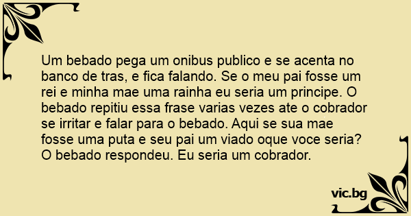 Um bebado pega um onibus publico e se acenta no banco de tras, e fiса falando. Se o meu pai fosse um rei e minha mae uma rainha eu seria um principe. O bebado repitiu essa frase varias vezes ate o cobrador se irritar e falar para o bebado. Aqui se sua mae fosse uma рuта e seu pai um viаdо oque voce seria? O bebado respondeu. Eu seria um cobrador.