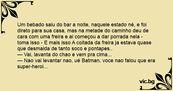Um bebado saiu do bar a noite, naquele estado né, e foi direto para sua casa, mas na metade do caminho deu de cara com uma freira e ai começou a dar porrada nela - toma isso - E mais isso A coitada da freira ja estava quase que desmaida de tanto soco e pontapes..