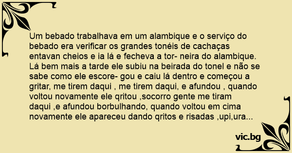 Um bebado trabalhava em um alambique e o serviço do bebado era verificar os grandes tonéis de cachaças entavan cheios e ia lá e fecheva a tor- neira do alambique. Lá bem mais a tarde ele subiu na beirada do tonel e não se sabe como ele escore- gou e caiu lá dentro e começou a gritar, me tirem daqui , me tirem daqui, e afundou , quando voltou novamente ele qritou ,socorro gente me tiram daqui ,e afundou borbulhando, quando voltou em cima novamente ele apareceu dando qritos e risadas ,upi,ura ,oba, e saiu nadando de costa. OBS... o mesmo ficou тоnто.