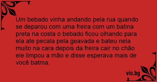 Um bebado vinha andando pela rua quando se deparou com uma freira com um batina preta na costa o bebado ficou olhando para ela ate pecala pela geavada e bateu nela muito na cara depois da freira cair no chão ele limpou a mão e disse esperava mais de você batma.