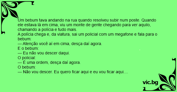 Um bebum tava andando na rua quando resolveu subir num poste. Quando ele estava lá em cima, viu um monte de gente chegando para ver aquilo, chamando a polícia e tudo mais.