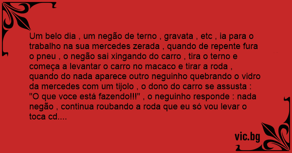 Um belo dia , um negão de terno , gravata , etc , ia para o trabalho na sua mercedes zerada , quando de repente fura o pneu , o negão sai xingando do carro , tira o terno e começa a levantar o carro no macaco e tirar a roda , quando do nada aparece outro neguinho quebrando o vidro da mercedes com um tijolo , o dono do carro se assusta :