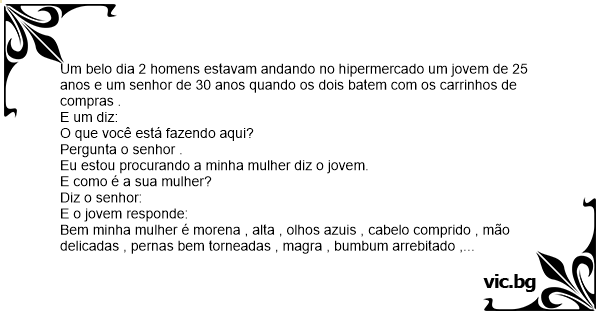 Um belo dia 2 homens estavam andando no hipermercado um jovem de 25 anos e um senhor de 30 anos quando os dois batem com os carrinhos de compras .