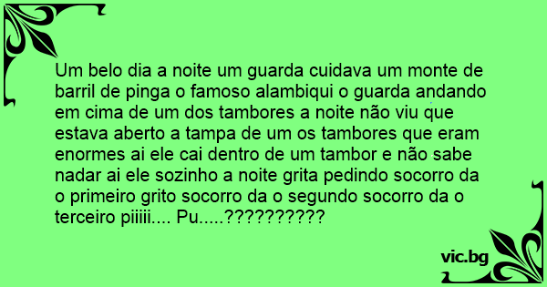 Um belo dia a noite um guarda cuidava um monte de barril de pinga o famoso alambiqui o guarda andando em cima de um dos tambores a noite não viu que estava aberto a tampa de um os tambores que eram enormes ai ele cai dentro de um tambor e não sabe nadar ai ele sozinho a noite grita pedindo socorro da o primeiro grito socorro da o segundo socorro da o terceiro piiiii.... Pu.....??????????