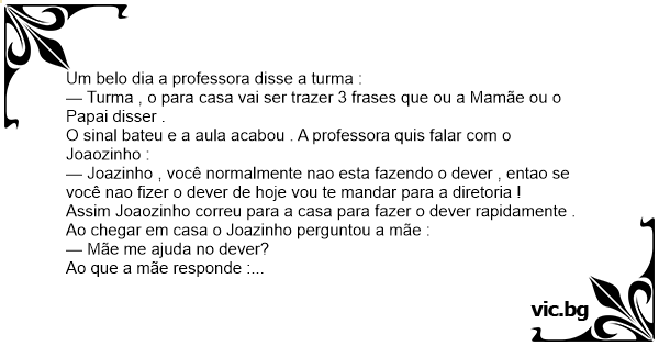 — Turma , o para casa vai ser trazer 3 frases que ou a Mamãe ou o Papai disser .