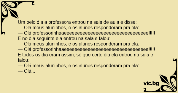 — Meu aluninhos eu vou chagar aqui na escola amanhã e vou falar bom dia mas eu quero que ninguém responda, ta bom????, e os alunos responderam: