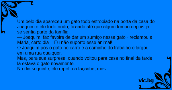 — Joaquim, faz favoire de dar um sumiço nesse gato - reclamou a Maria, certo dia. - Eu não suporto esse animal!