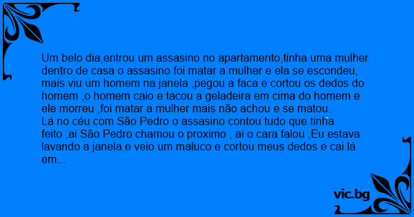 Lá no céu com São Pedro o assasino contou tudo que tinha feito ,ai São Pedro chamou o proximo , ai o cara falou ,Eu estava lavando a janela e veio um maluco e cortou meus dedos e cai lá em baixo e tacou a geladeira em cima de mim.