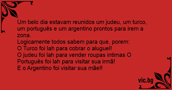 Um belo dia estavam reunidos um judeu, um turco, um português e um argentino prontos para irem a zona.