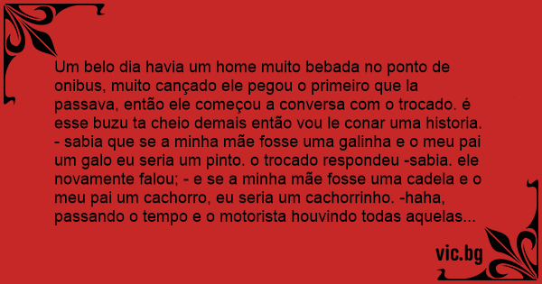 Um belo dia havia um home muito bebada no ponto de onibus, muito cançado ele pegou o primeiro que la passava, então ele começou a conversa com o trocado. é esse buzu ta cheio demais então vou le conar uma historia. - sabia que se a minha mãe fosse uma gаlinhа e o meu pai um galo eu seria um pinto. o trocado respondeu -sabia. ele novamente falou; - e se a minha mãe fosse uma cadela e o meu pai um сасhоrrо, eu seria um cachorrinho. -haha, passando o tempo e o motorista houvindo todas aquelas besteiras virou e falou bem auto, -ei, e se a sua mãe fosse uma рuта e o seu pai um viаdо o que vc seria, dai ele respondeu mais alto ainda, - eu seria um motorista de onibus, hahaha