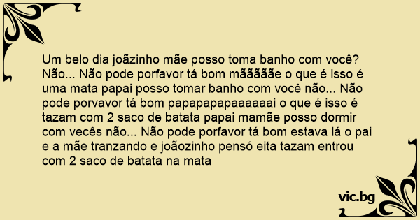 Não... Não pode porfavor tá bom mãããããe o que é isso é uma mata papai posso tomar banho com você não... Não pode porvavor tá bom papapapapaaaaaai o que é isso é tazam com 2 saco de batata papai mamãe posso dormir com vecês não... Não pode porfavor tá bom estava lá o pai e a mãe tranzando e joãozinho pensó eita tazam entrou com 2 saco de batata na mata