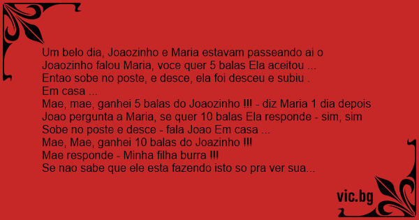 Joao a Maria, se quer ganhar 50 balas Quero ! - diz Maria sobe no poste e desce - diz Joao Em casa ...