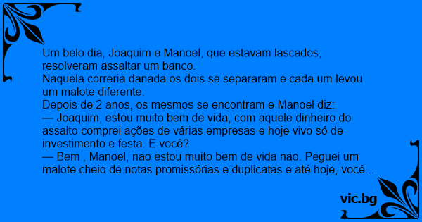 — Joaquim, estou muito bem de vida, com aquele dinheiro do assalto comprei ações de várias empresas e hoje vivo só de investimento e festa. E você?