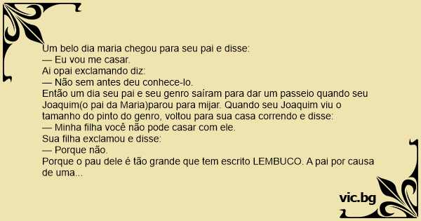 Então um dia seu pai e seu genro saíram para dar um passeio quando seu Joaquim(o pai da Maria)parou para mijar. Quando seu Joaquim viu o tamanho do pinto do genro, voltou para sua casa correndo e disse: