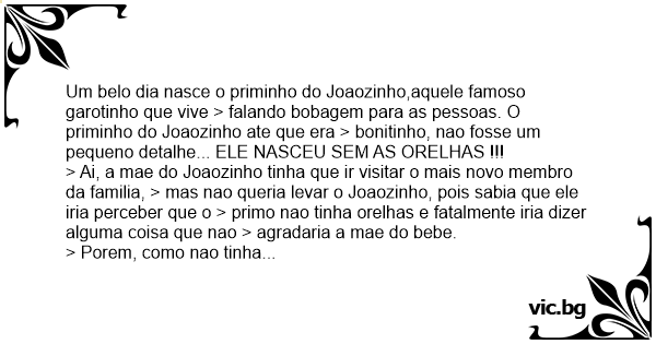 Um belo dia nasce o priminho do Joaozinho,aquele famoso garotinho que vive > falando bobagem para as pessoas. O priminho do Joaozinho ate que era > bonitinho, nao fosse um pequeno detalhe... ELE NASCEU SEM AS ORELHAS !!!