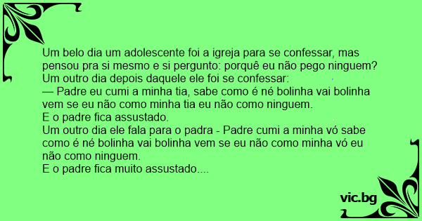 Um outro dia ele fala confessa para o padre - Padre cumi a minha mãe sabe como é né bolinha vai bolinha vem se eu não como minha mãe eu não como ninguem.