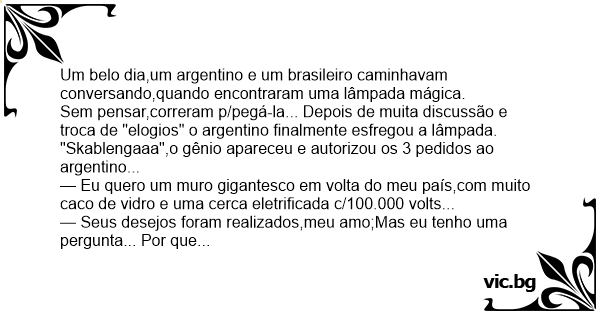 Um belo dia,um argentino e um brasileiro caminhavam conversando,quando encontraram uma lâmpada mágica.