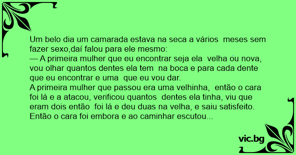 — A primeira mulher que eu encontrar seja ela velha ou nova, vou olhar quantos dentes ela tem na boca e para cada dente que eu encontrar e uma que eu vou dar.