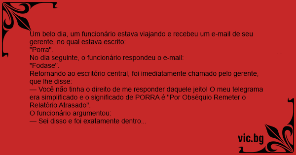 — Você não tinha o direito de me responder daquele jeito! O meu telegrama era simplificado e o significado de РОRRА é "Por Obséquio Remeter o Relatório Atrasado".
