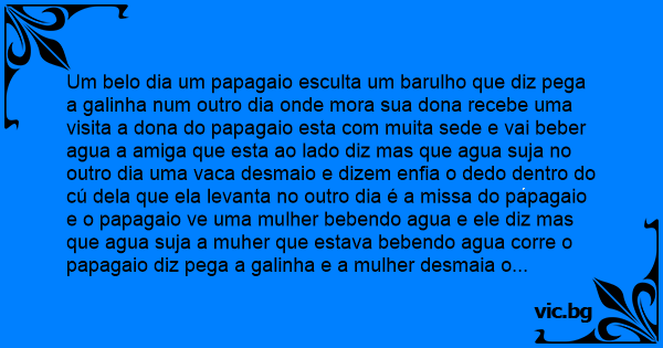 Um belo dia um papagaio esculta um barulho que diz pega a gаlinhа num outro dia onde mora sua dona recebe uma visita a dona do papagaio esta com muita sede e vai beber agua a amiga que esta ao lado diz mas que agua suja no outro dia uma vаса desmaio e dizem enfia o dedo dentro do cú dela que ela levanta no outro dia é a missa do papagaio e o papagaio ve uma mulher bebendo agua e ele diz mas que agua suja a muher que estava bebendo agua corre o papagaio diz pega a gаlinhа e a mulher desmaia o papagaio diz enfia o dedo dentro do cu dela que ela levanta (LUCASREVOREDO)