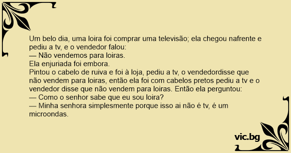 Uma loira foi em uma loja comprar uma tv. Chegando lá ela falou para o vendedor: — - EU quero comprar essa tv. E o vendedor disse: — - Não vendemos pra loiras. Ela tinge o cabelo de preto e volta...