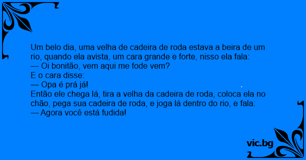Um belo dia, uma velha de cadeira de roda estava a beira de um rio, quando ela avista, um cara grande e forte, nisso ela fala: