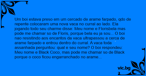 Um boi estava preso em um cercado de arame farpado, qdo de repente colocaram uma nova vаса no curral ao lado. Ela jogando todo seu charme disse: Meu nome e Florisbela mas pode me chamar so de Floris, porque bela eu ja sou... O boi nao resistindo aos encantos da vаса ultrapassou a cerca de arame farpado e entrou dentro do curral. A vаса toda assanhada perguntou: qual e seu nome? O boi respondeu: Meu nome e Black Coco, mas pode me chamar so de Black porque o coco ficou engarranchado no arame...