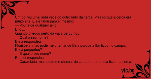 Um boi viu uma linda vаса do outro lado da cerca. Mas só que a cerca era muito alta. E ele falou para si mesmo: