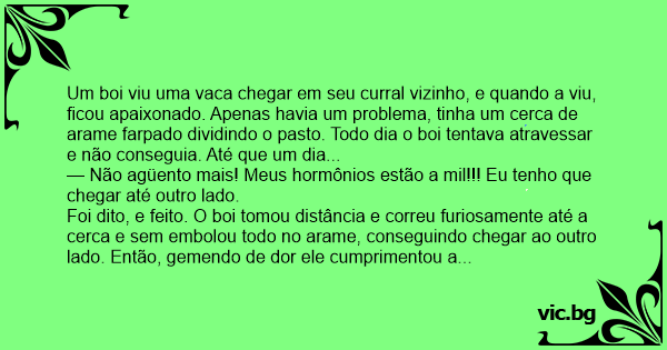 Um boi viu uma vаса chegar em seu curral vizinho, e quando a viu, ficou apaixonado. Apenas havia um problema, tinha um cerca de arame farpado dividindo o pasto. Todo dia o boi tentava atravessar e não conseguia. Até que um dia...