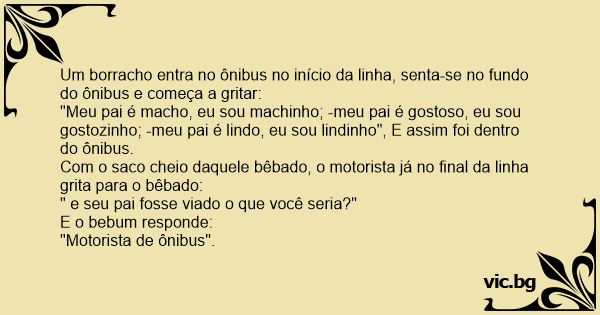 "Meu pai é macho, eu sou machinho; -meu pai é gostoso, eu sou gostozinho; -meu pai é lindo, eu sou lindinho", E assim foi dentro do ônibus.