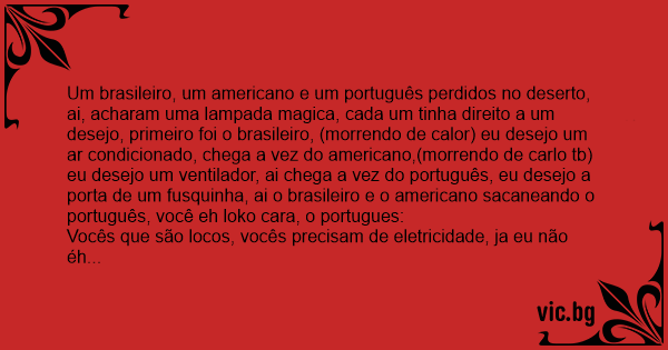Um brasileiro, um americano e um português perdidos no deserto, ai, acharam uma lampada magica, cada um tinha direito a um desejo, primeiro foi o brasileiro, (morrendo de calor) eu desejo um ar condicionado, chega a vez do americano,(morrendo de carlo tb) eu desejo um ventilador, ai chega a vez do português, eu desejo a porta de um fusquinha, ai o brasileiro e o americano sacaneando o português, você eh loko cara, o portugues: