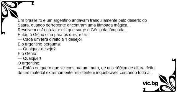 Um brasileiro e um argentino andavam tranquilamente pelo deserto do Saara, quando derrepente encontram uma lâmpada mágica...