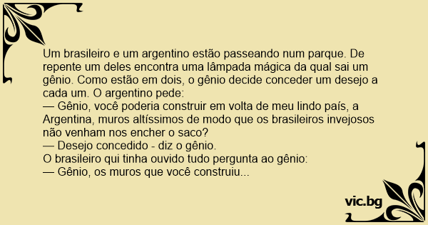 Um brasileiro e um argentino estão passeando num parque. De repente um deles encontra uma lâmpada mágica da qual sai um gênio. Como estão em dois, o gênio decide conceder um desejo a cada um. O argentino pede: