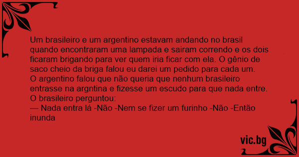 Um brasileiro e um argentino estavam andando no brasil quando encontraram uma lampada e sairam correndo e os dois ficaram brigando para ver quem iria ficar com ela. O gênio de saco cheio da briga falou eu darei um pedido para cada um.