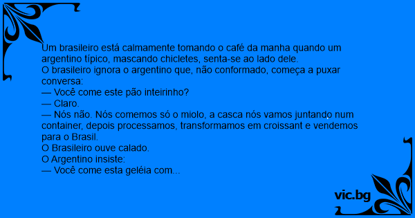Um brasileiro estava na argentina curtindo numa padaria seu café da manhã quando um argentino sentou do lado dele , pois um chiclete na boca e disse : -Oi colega ! O brasileiro : -... oi ... O...