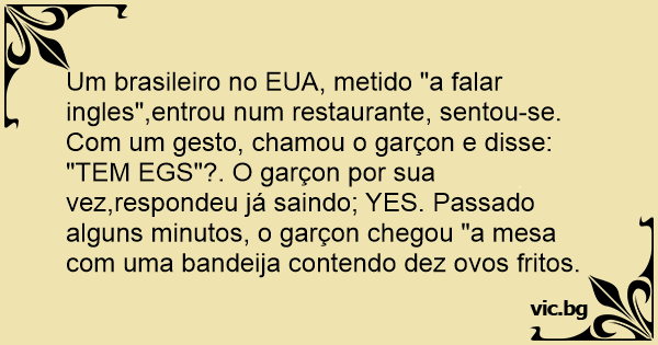 "TEM EGS"?. O garçon por sua vez,respondeu já saindo; YES. Passado alguns minutos, o garçon chegou "a mesa com uma bandeija contendo dez ovos fritos.