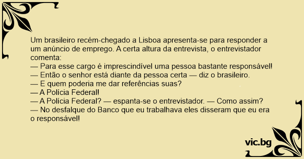 Um brasileiro recém-chegado a Lisboa apresenta-se para responder a um anúncio de emprego. A certa altura da entrevista, o entrevistador comenta: