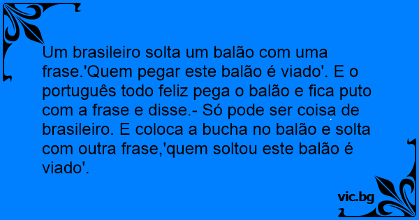 Um brasileiro solta um balão com uma frase.'Quem pegar este balão é viаdо'. E o português todo feliz pega o balão e fiса рuто com a frase e disse.- Só pode ser coisa de brasileiro. E coloca a bucha no balão e solta com outra frase,'quem soltou este balão é viаdо'.