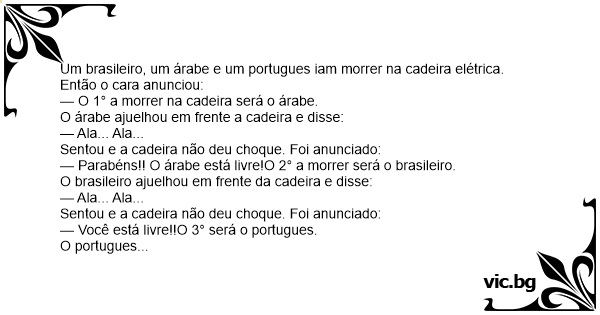 Um brasileiro, um árabe e um portugues iam morrer na cadeira elétrica. Então o cara anunciou: