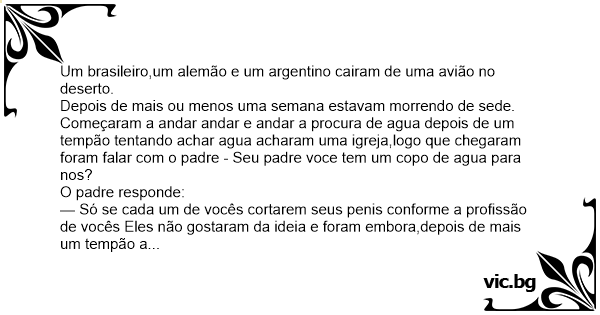 — Só se cada um de vocês cortarem seus реnis conforme a profissão de vocês Eles não gostaram da ideia e foram embora,depois de mais um tempão a procura de agua o argentino e o alemão falam para o brasileiro: