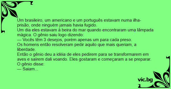 Um brasileiro, um americano e um português estavam numa ilha-prisão, onde ninguém jamais havia fugido.