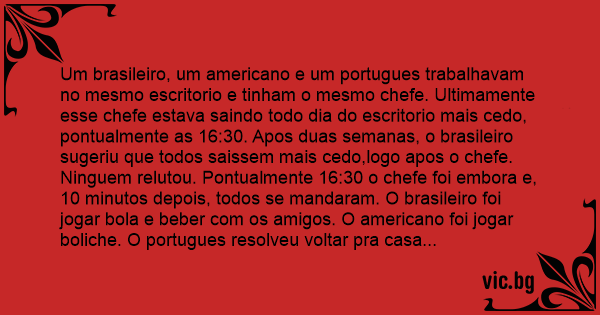 Um brasileiro, um americano e um portugues trabalhavam no mesmo escritorio e tinham o mesmo chefe. Ultimamente esse chefe estava saindo todo dia do escritorio mais cedo, pontualmente as 16:30. Apos duas semanas, o brasileiro sugeriu que todos saissem mais cedo,logo apos o chefe.