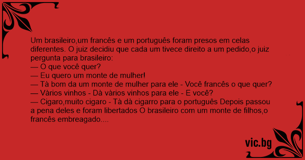 Um brasileiro,um francês e um português foram presos em celas diferentes. O juiz decidiu que cada um tivece direito a um pedido,o juiz pergunta para brasileiro: