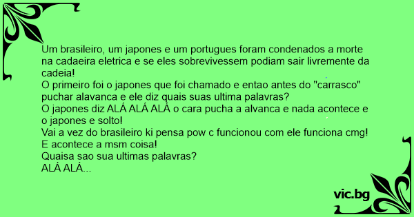 Um brasileiro, um japones e um portugues foram condenados a morte na cadaeira eletrica e se eles sobrevivessem podiam sair livremente da cadeia!