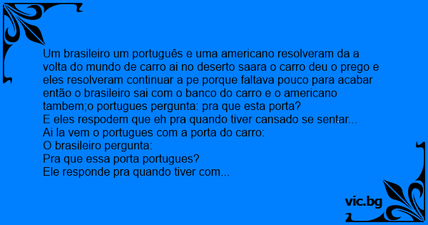 Um brasileiro um português e uma americano resolveram da a volta do mundo de carro ai no deserto saara o carro deu o prego e eles resolveram continuar a pe porque faltava pouco para acabar então o brasileiro sai com o banco do carro e o americano tambem;o portugues pergunta: pra que esta porta?