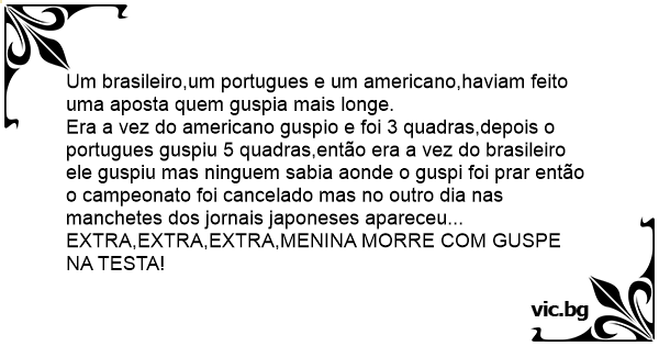 Era a vez do americano guspio e foi 3 quadras,depois o portugues guspiu 5 quadras,então era a vez do brasileiro ele guspiu mas ninguem sabia aonde o guspi foi prar então o campeonato foi cancelado mas no outro dia nas manchetes dos jornais japoneses apareceu... EXTRA,EXTRA,EXTRA,MENINA MORRE COM GUSPE NA TESTA!