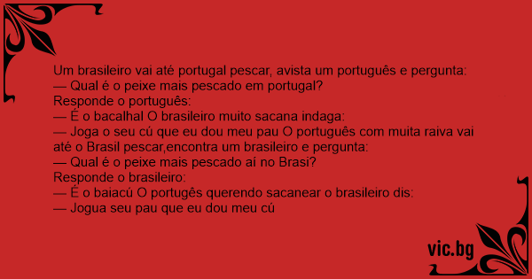 — Joga o seu cú que eu dou meu раu O português com muita raiva vai até o Brasil pescar,encontra um brasileiro e pergunta: