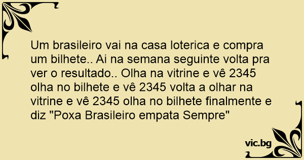 Um brasileiro vai na casa loterica e compra um bilhete.. Ai na semana seguinte volta pra ver o resultado.. Olha na vitrine e vê 2345 olha no bilhete e vê 2345 volta a olhar na vitrine e vê 2345 olha no bilhete finalmente e diz "Poxa Brasileiro empata Sempre"